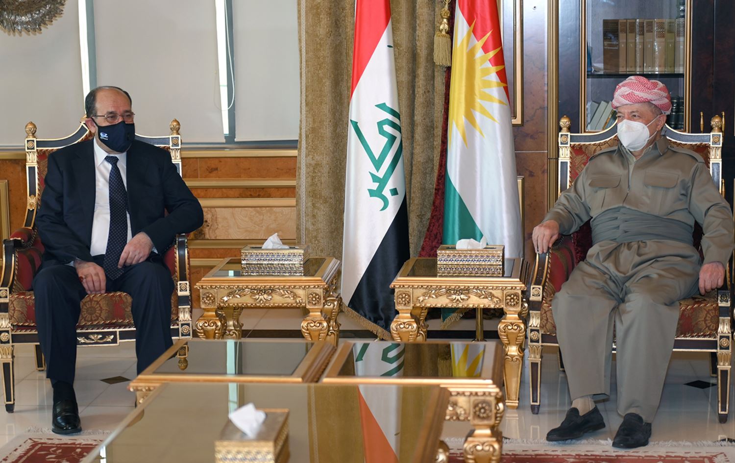 Leader of the Coordination Framework Nouri al-Maliki (left), and KDP Leader Masoud Barzani (right) in Erbil on August 25, 2021. Photo: Barzani's office.
