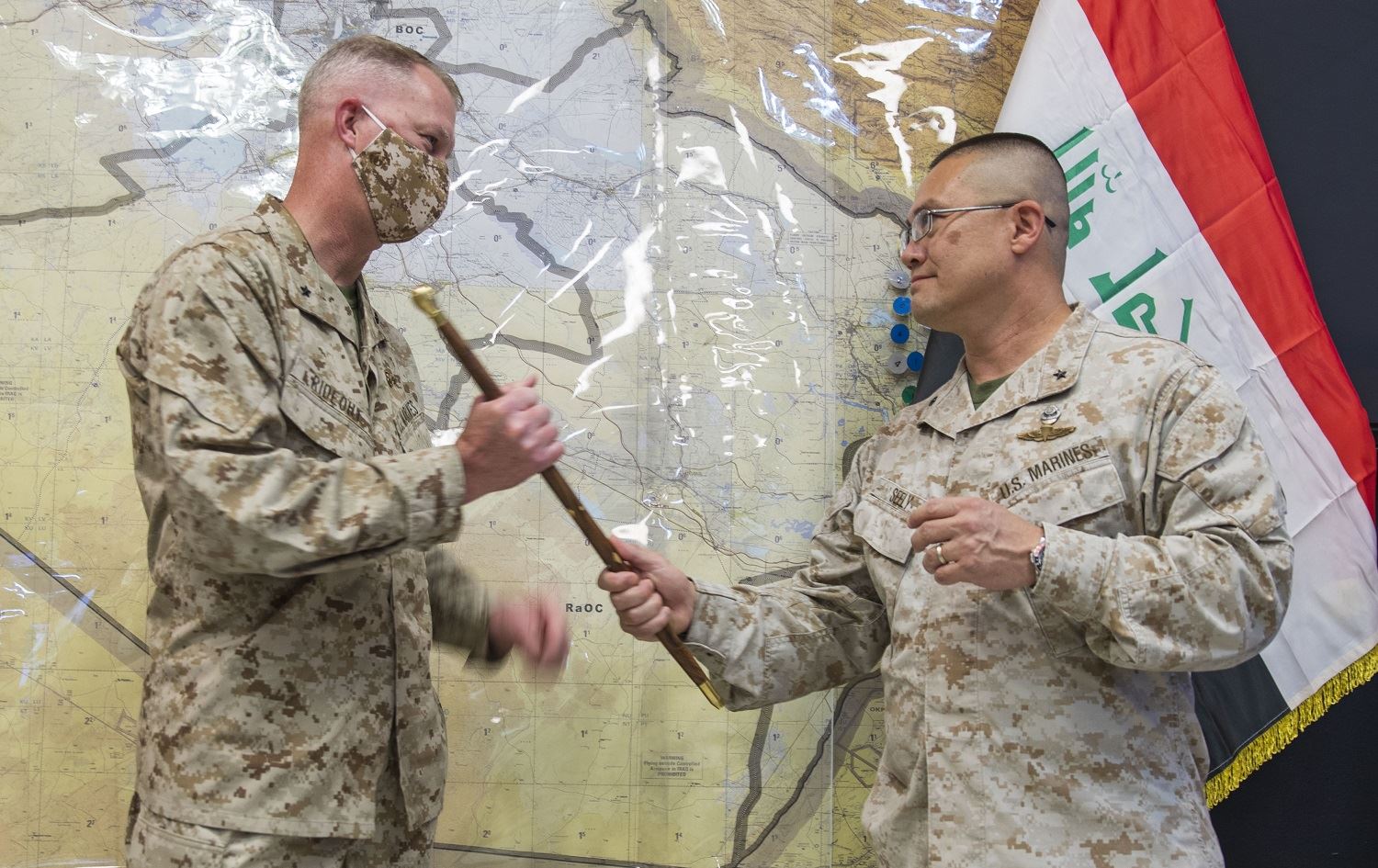 US Marine Brig. Gen. Bill Seely (right), departing commander of Combined Joint Task Force-Operation Inherent Resolve's Task Force Iraq, passes the ceremonial "swagger stick" to U.S. Marine Brig. Gen. Ryan Rideout, incoming Military Advisory Group director. Photo: Sgt. Temos Wooten / US Army