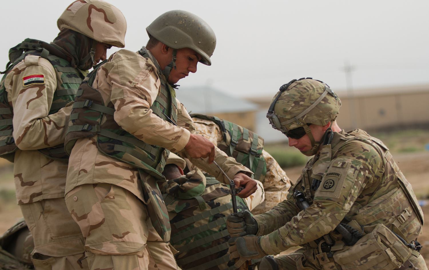 A US officer assists an Iraqi soldier at Camp Taji, Iraq. File photo: US Army Sargent. Cody Quinn / OIR