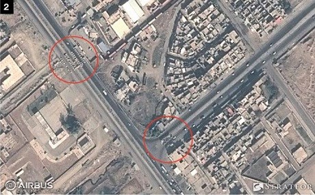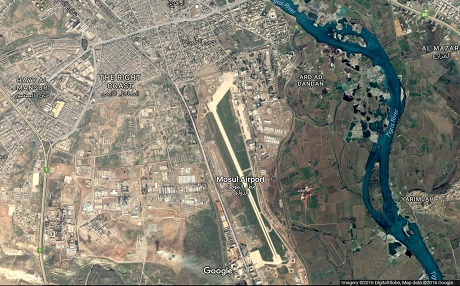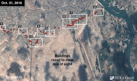 Satellite imagery dated October 31 and published by Stratfor shows ISIS has cleared building north of Mosul airport and erected barriers (indicated with red circles). Image: Stratfor
