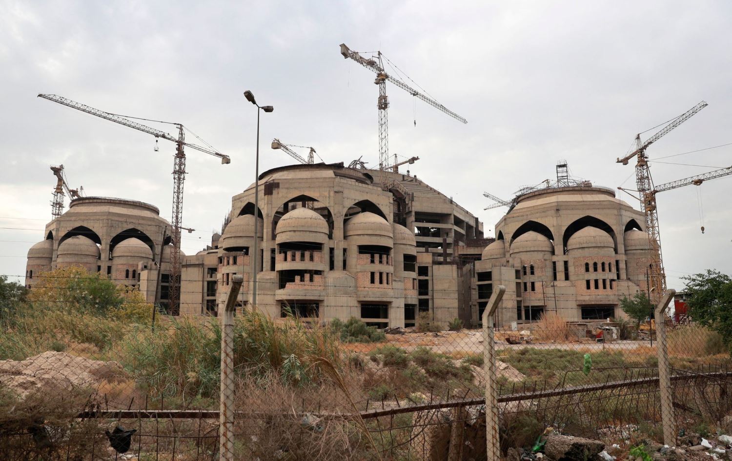 Several cranes are frozen in time above the edifice, which towers over the upscale Mansur district of the capital.