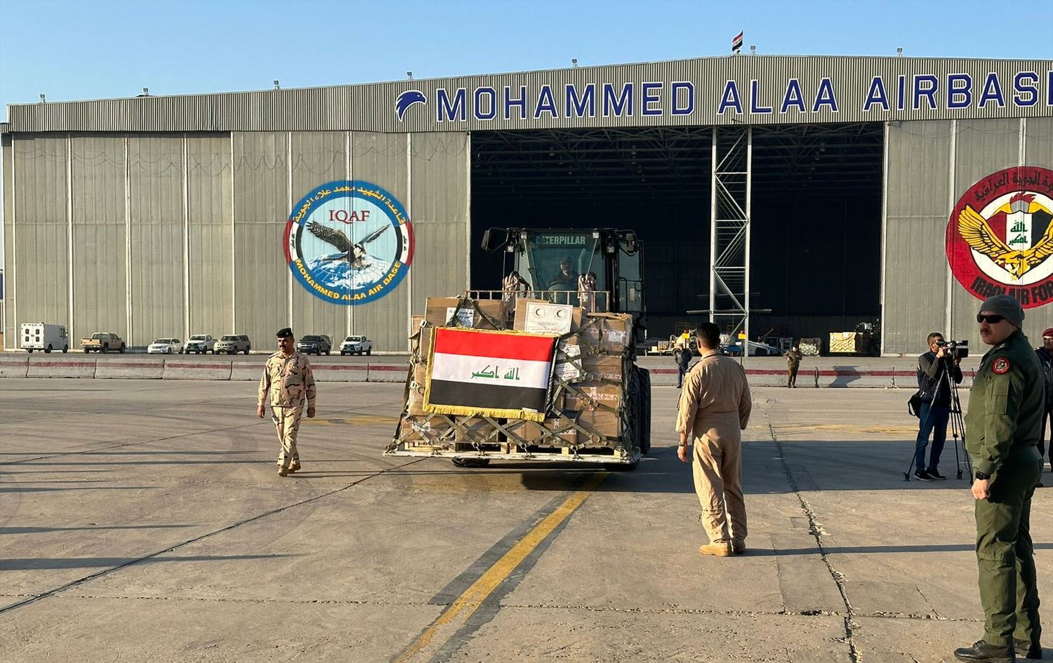 Iraqi humanitarian aid convoy to the Gaza Strip readies to leave for Egypt from Mohammed Alaa airbase in Baghdad on December 5, 2023. Photo: Iraqi defense ministry