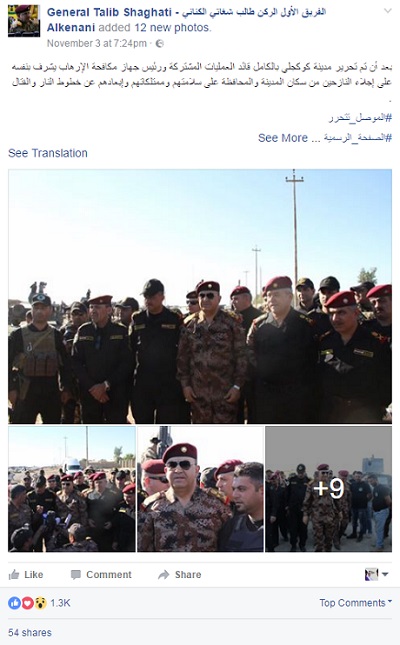 On November 3, leader of the Iraqi joint forces, General Talib Shaghati Kanani, uploaded 19 pictures on Facebook about the Iraqi push into the Gogjali district in Mosul.