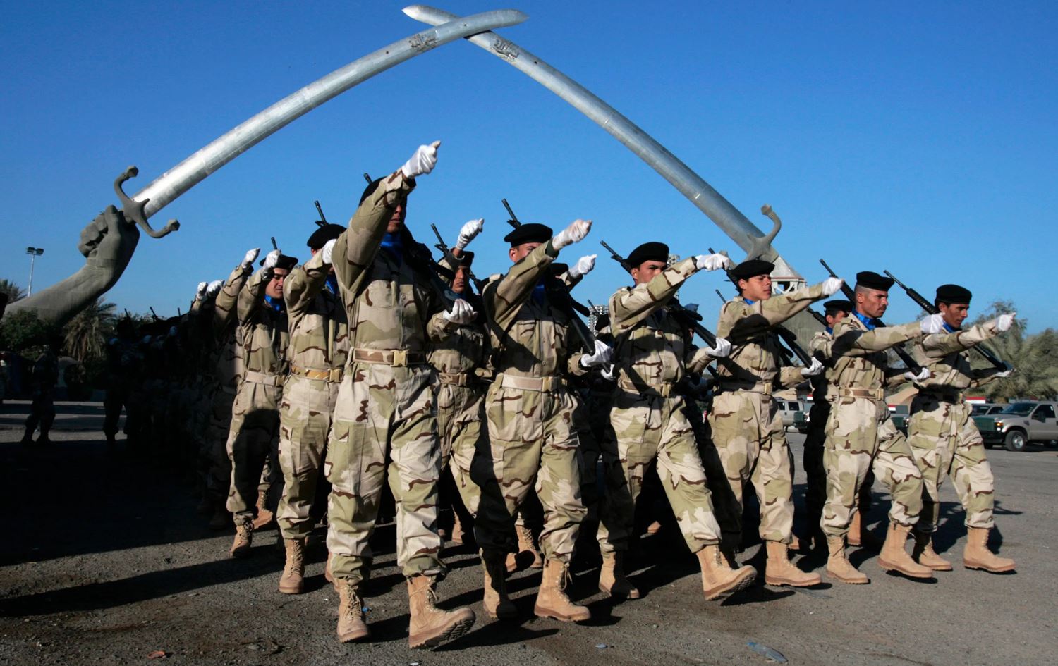 A file picture shows Iraqi soldiers practicing ahead of the Army Day parade at the “Victory Arch”, in Baghdad's Green Zone, Iraq. Photo: AFP