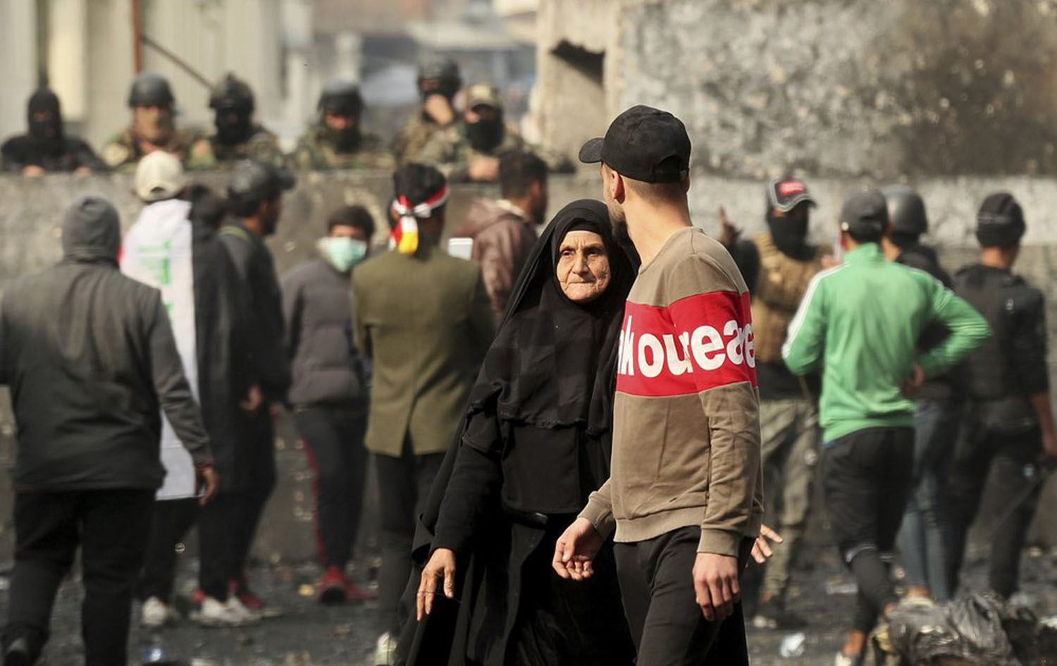 Anti-government protesters gather during clashes with security forces on Rasheed Street in Baghdad, Iraq, Friday, Dec. 6, 2019. (AP Photo/Hadi Mizban)
