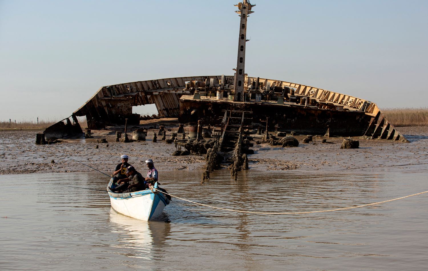 Iraqi men fish in their boat anchored in the Shatt al-Arab waterway next to the wreckage of a ship which was sunk during the 1980s Iraq-Iran war, near the southern Iraqi port city of al-Faw, on October 26, 2021. Hussein Faleh / AFP