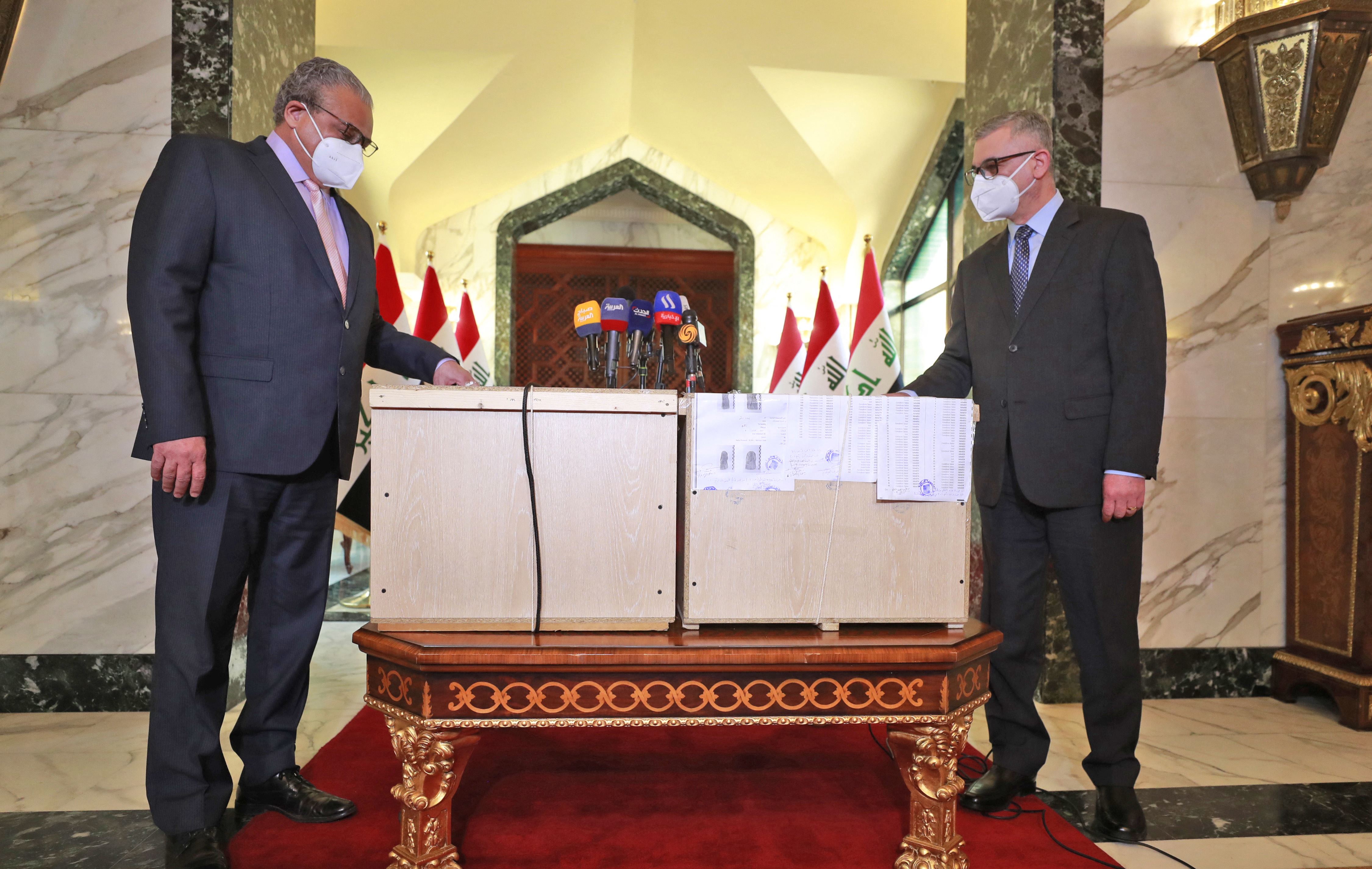 Laith Majid Hussein (left), head of Iraq's Antiquities Authority, is pictured with Iraqi deputy foreign minister, Ahmed Tahseen Barwari, during a press conference at Baghdad airport on February 7, 2022 following the arrival of more than 300 ancient artifacts from Lebanon. Photo: Ahmad al-Rubaye/AFP