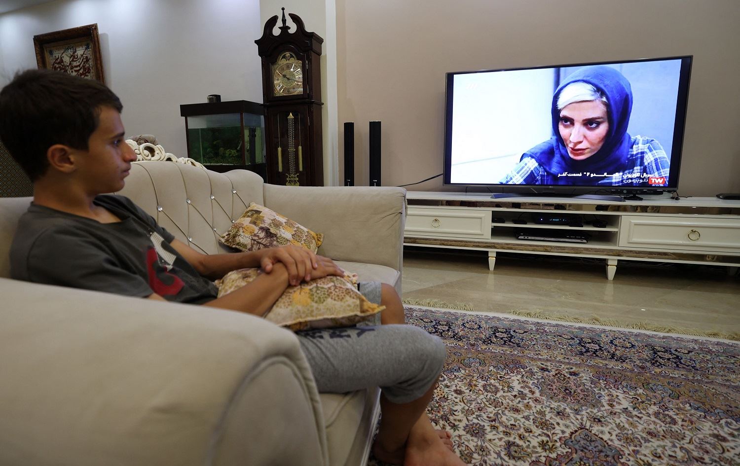 A young man watches an episode of the Iranian television series "Gando" at his home in Tehran on September 6, 2021. Photo: Atta Kenare/AFP
