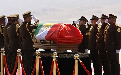 Talabani’s coffin, draped with the Kurdistan flag, was greeted with a 21-gun salute at the Sulaimani airport on Friday while received by local and world leaders such as President Masoud Barzani, Iraqi President Fuad Masum, and Iran’s Foreign Minister Javad Zarif, among others.