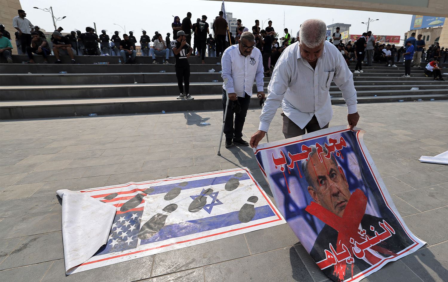 A man lays out a banner depicting Israel's Prime Minister Benjamin Netanyahu described as a "war criminal" at a memorial vigil for Hassan Nasrallah, the slain leader of the Lebanese Shiite group Hezbollah who was killed in an Israeli air strike in Beirut days earlier, in Baghdad's Tahrir Square on October 1, 2024. Photo: Ahmad al-Rubaye/AFP