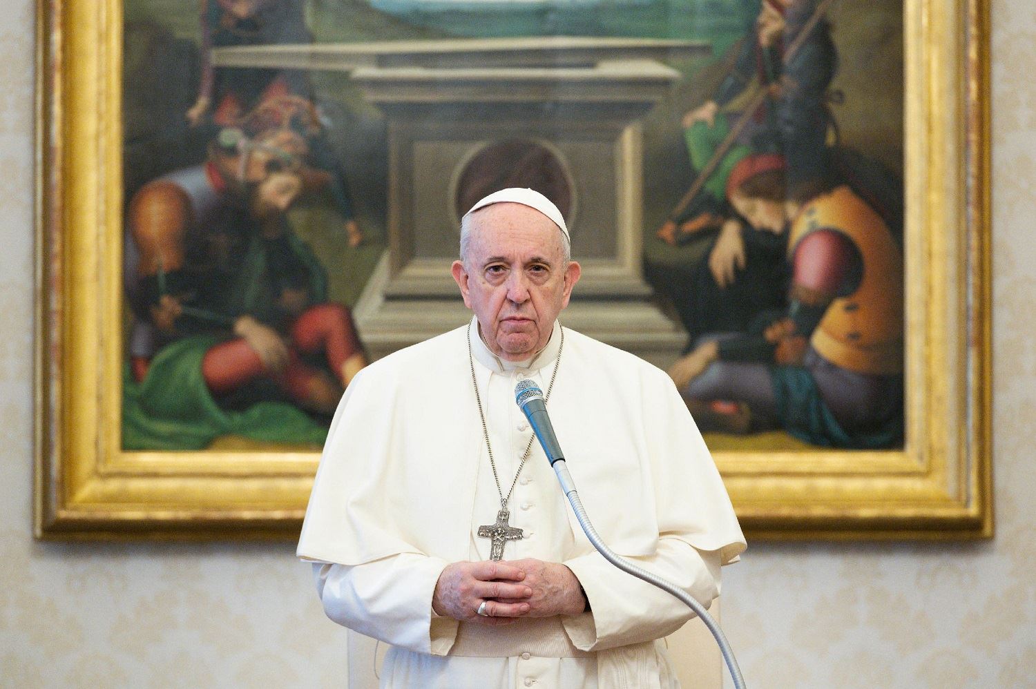 This photo taken and handout on December 2, 2020 shows Pope Francis holding a weekly private audience in live streaming in the library of the apostolic palace in The Vatican during the COVID-19 pandemic caused by the novel coronavirus. Photo: Handout / VATICAN MEDIA / AFP