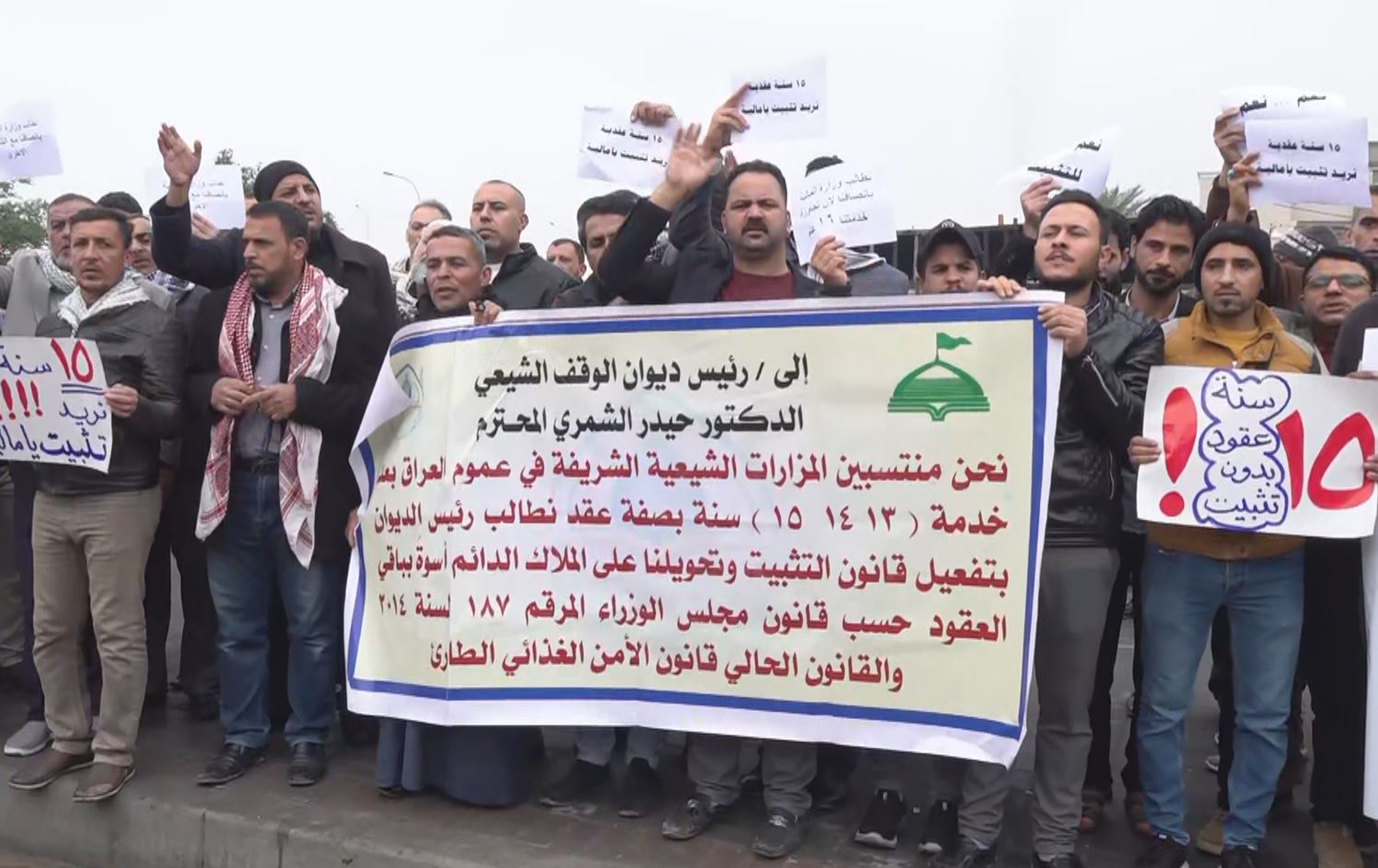 The protesters, some of whom have been working with the Shiite endowment by contract for the past 15 years, called on the government to make their employment permanent.