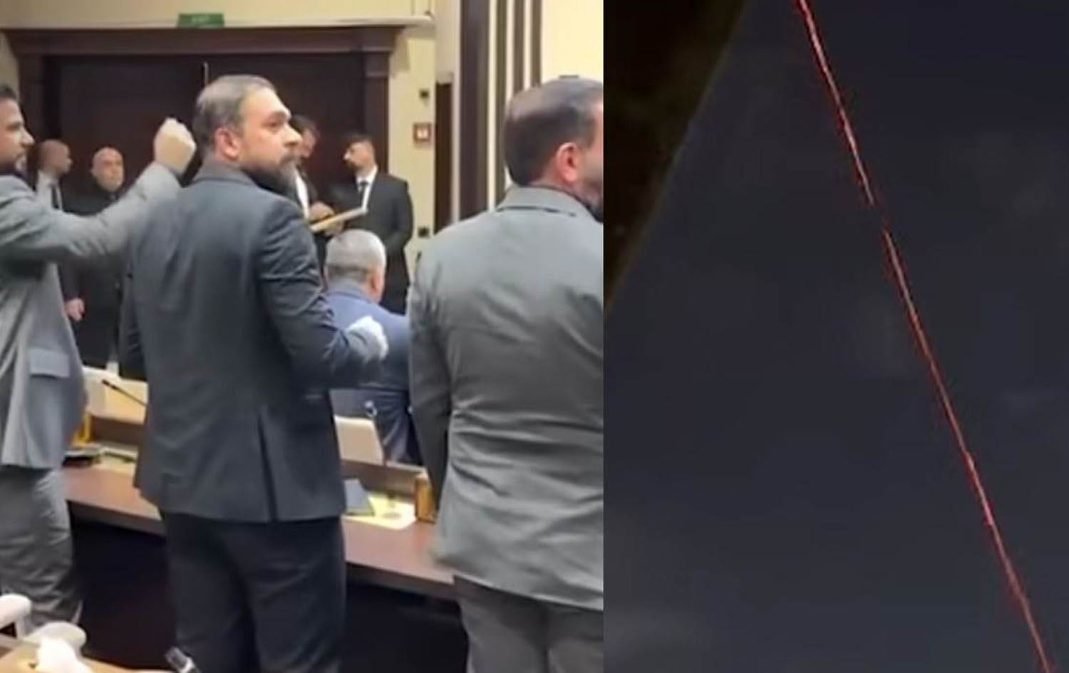 Iraqi lawmakers chant anti-US slogans (left) and air defense systems intercepting projectiles over Baghdad’s Green Zone (right) on March 7, 2026. Photos: Screengrab / Submitted