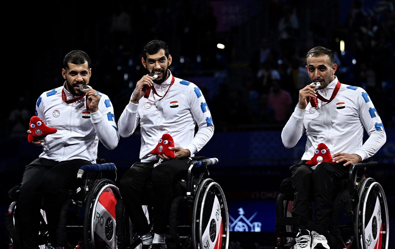 Iraq’s silver medalists Haider Ali, Zain Al-Abideen Gilan, and Ali Ammar pose on the podium of the wheelchair fencing men’s epee team event during the Paris 2024 Paralympic Games at the Grand Palais in Paris on September 7, 2024. Photo: Julien De Rosa/AFP