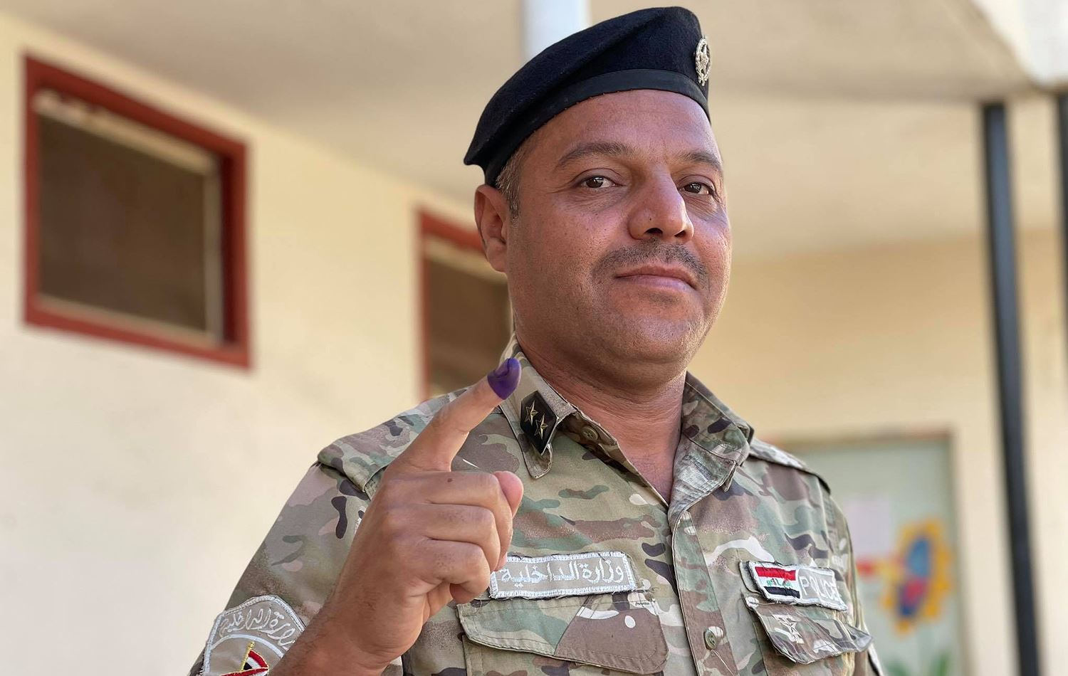 A member of the Iraqi security forces raises his finger after casting a vote in Kirkuk on October 8, 2021. IDPs and security forces vote two days before the public vote. Photo: Hardi Mohammed/ Rudaw