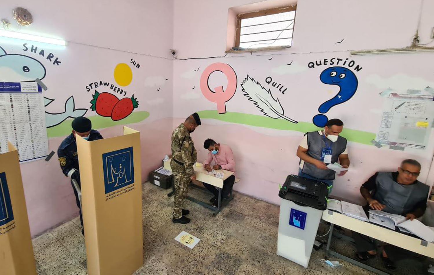 Iraqi security forces casting their votes on October 8, 2021 in Baghdad. Security forces, IDPs and prisoners vote two days before the public vote.