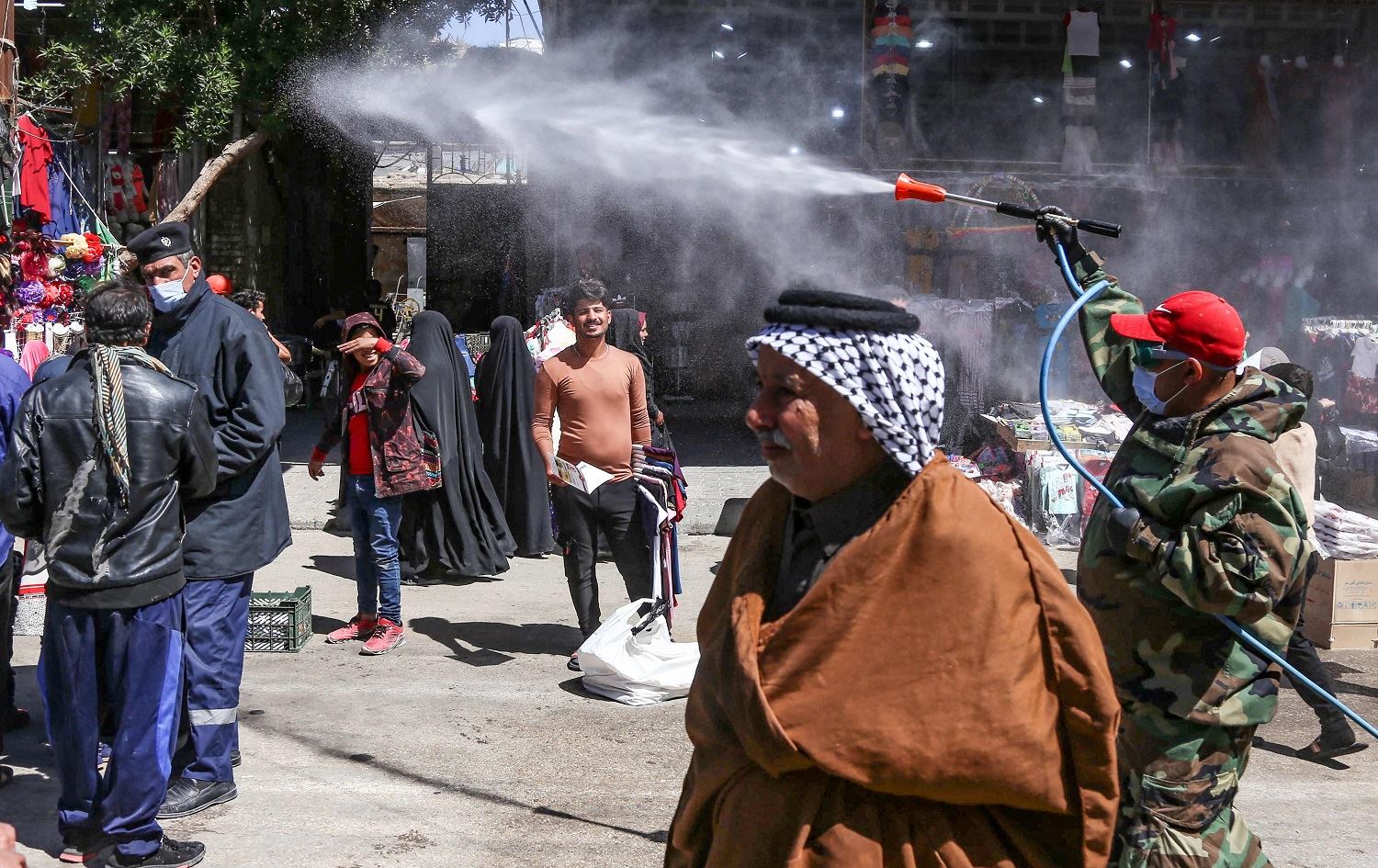 A member of the Iraqi security forces sprays disinfectant in a busy Karbala street on March 28, 2021, ahead of festivities marking the birth of Imam al-Mahdi,revered by Shiites as the coming Messiah. Photo: Mohammed Sawaf/AFP