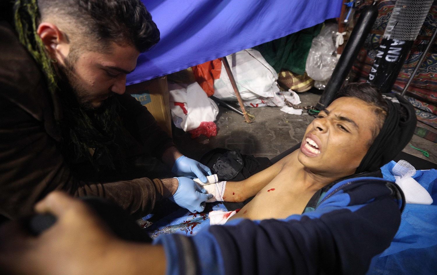 A wounded protester is treated at a mobile clinic in Tahrir Square after unidentified men attacked an anti-government protest camp in Baghdad late on December 6, 2019. Photo: Stringer / AFP