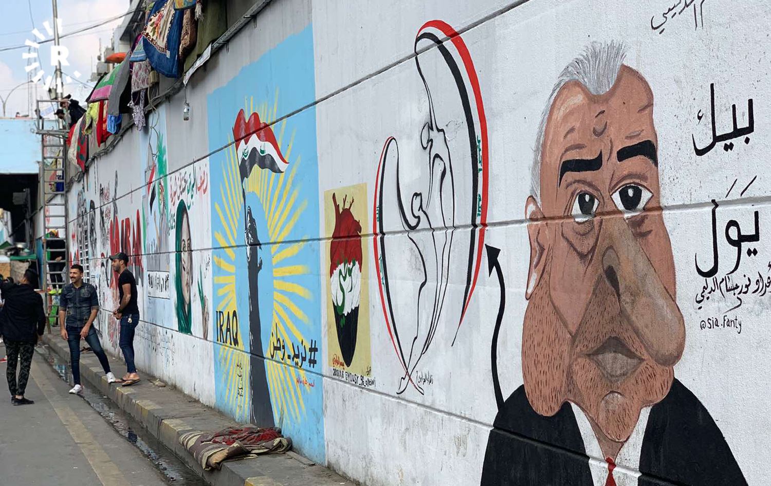 Protesters stand in front of anti-government murals painted in Baghdad's Tahrir Square, on December 4, 2019. Photo: Lawk Ghafuri/Rudaw