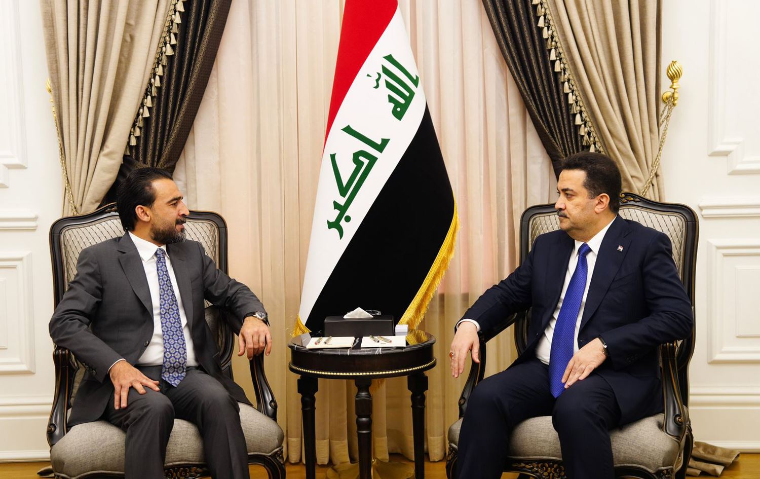 Iraq’s Prime Minister Mohammed Shia’ al-Sudani (right) receives Parliamentary Speaker Mohammed al-Halbousi (left) in Baghdad on May 9, 2023. Photo: PM Sudani's office