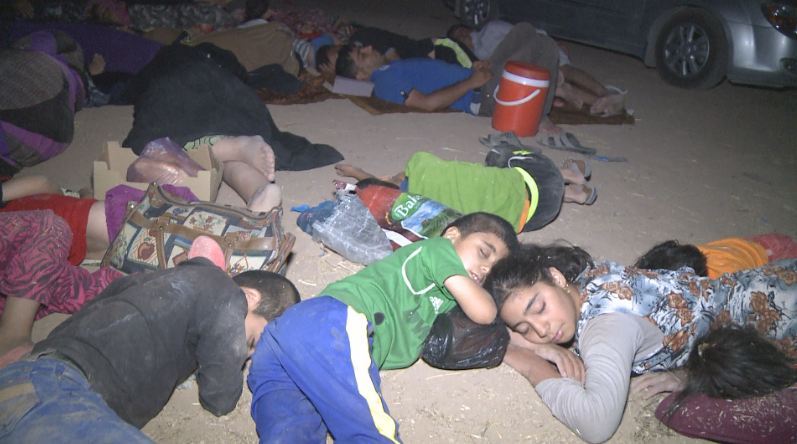 One father could no longer contain his frustration, entreating Rudaw to look at his family as they slept barefoot on the ground: “Look at the children! They are all hungry. Send us food! We have none, we are hungry and thirsty. We left our homes 20 days ago. We only hope to go somewhere safe.”