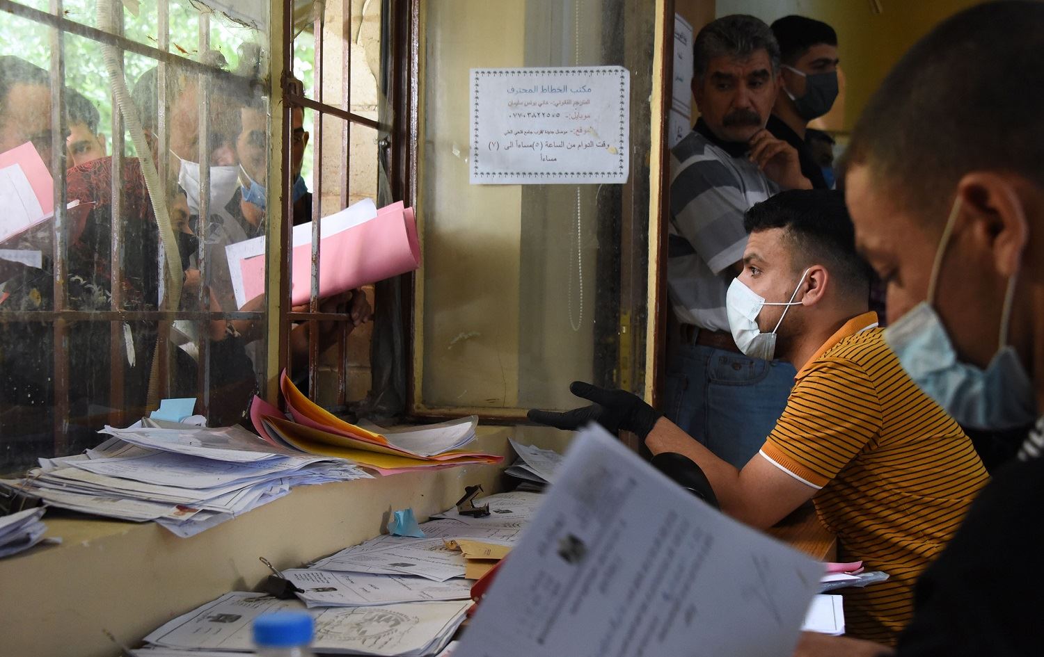 Iraqi employees at the general compensation department in Mosul speak to civilians waiting for their compensations following the destruction of their homes during the Battle of Mosul on June 15, 2020. Photo: Zaid al-Obeidi / AFP
