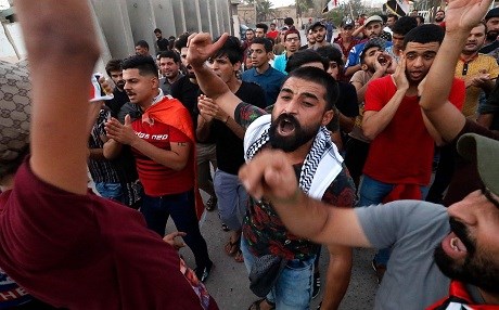 Iraqi men demonstrate in the southern oil-rich city of Basra, the heart of recent protests against power shortages, graft and other social ills, on August 10, 2018 Iraq has been gripped by protests over power outages, unemployment, state mismanagement and a lack of clean water. Photo: Haidar Mohammed Ali | AFP