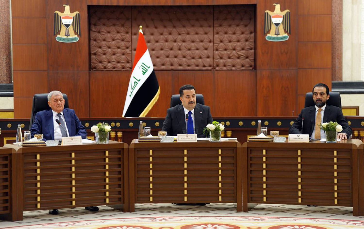 From left: Iraqi President Abdul Latif Rashid, Prime Minister Mohammed Shia' al-Sudani, and Parliament Speaker Mohammed al-Halbousi during a meeting of the State Administration Coalition on September 9, 2023. Photo: Sudani's office