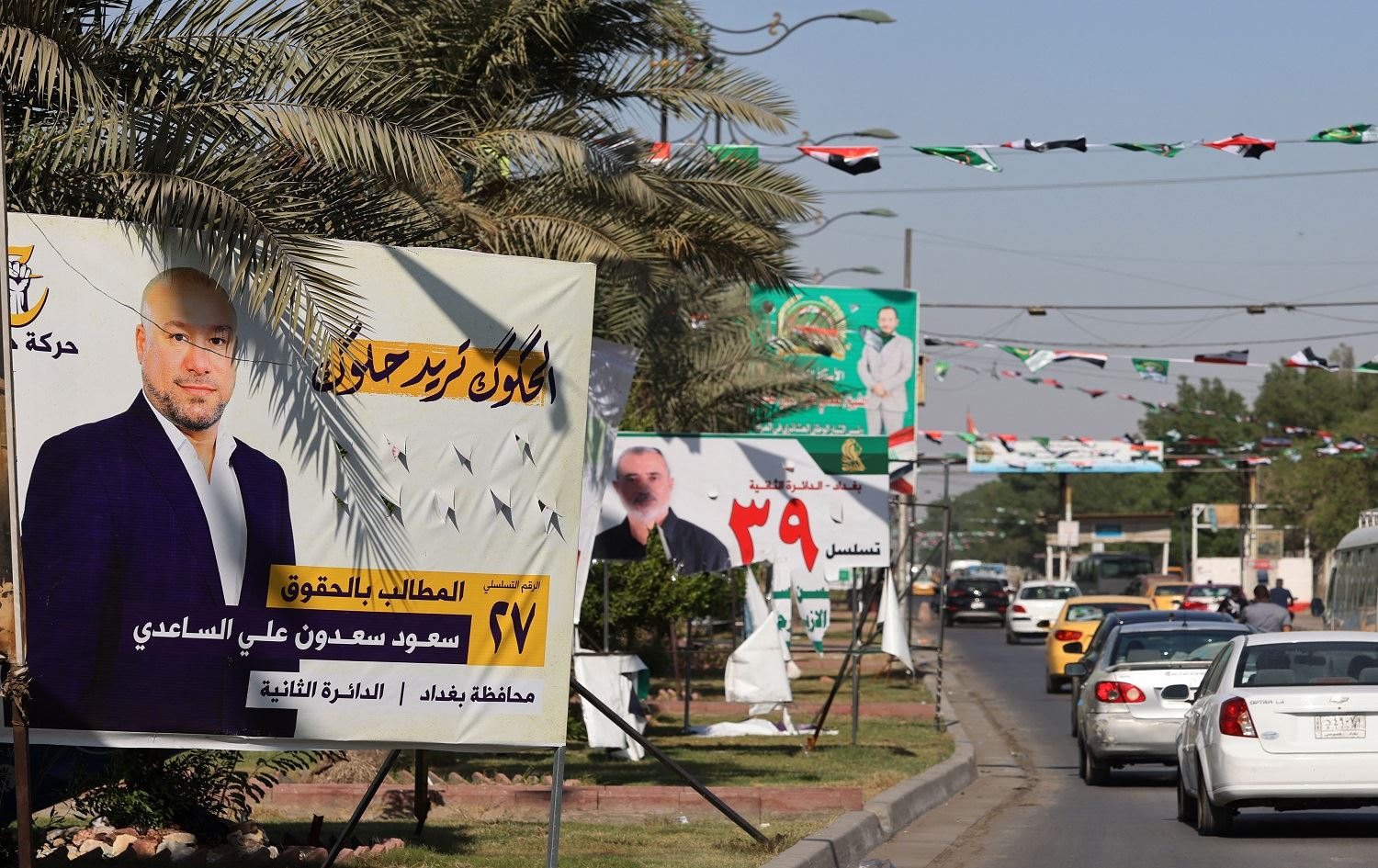 Cars drive in front of electoral billboards of candidates for the upcoming parliamentary elections, in the Iraqi capital Baghdad's Sadr City neighbourhood, on October 9, 2021. Photo: Ahmad al-Rubaye / AFP