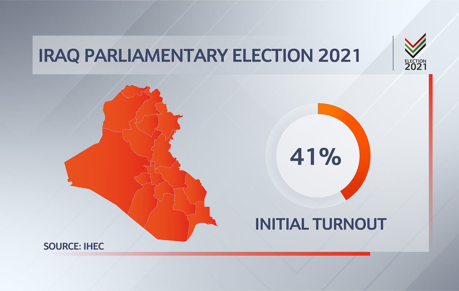 Iraq’s electoral commission announced on Monday that the “initial” turnout to the parliamentary elections stood at 41 percent based on 94 percent of the ballots received.