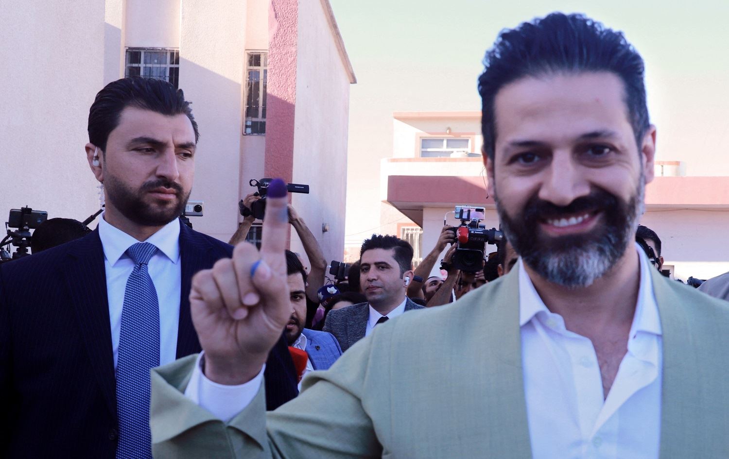 Qubad Talabani, the vice president of the Kurdistan Regional Government, shows his inked finger after voting in early parliamentary elections in Sulaimani on October 10, 2021. Photo: Shwan Mohammed / AFP