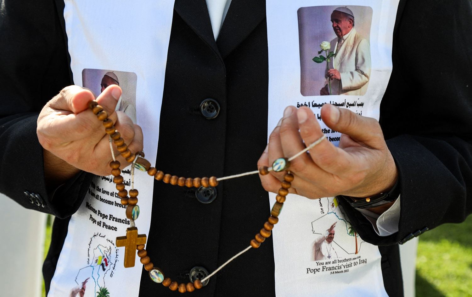 A nun holds a rosary while praying as she awaits the arrival of Pope Francis at Erbil's Franso Hariri Stadium on March 7, 2021. Photo: Safin Hamed/AFP