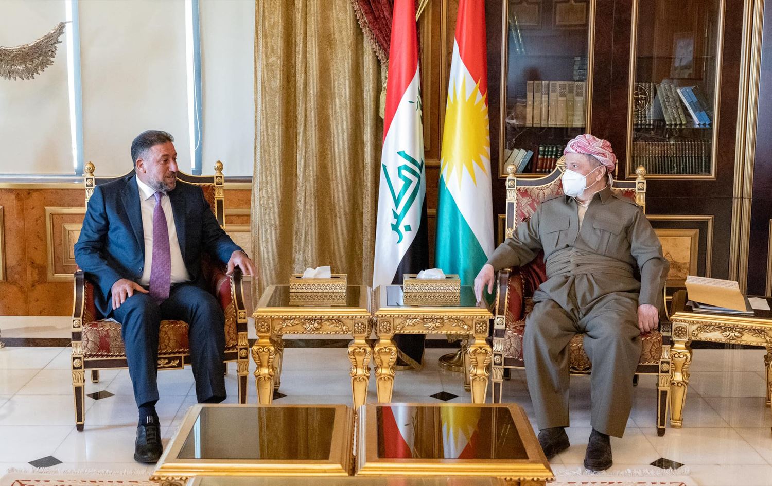 KDP President Masoud Barzani received Khamis al-Khanjar, head of the Sovereignty Alliance, in Erbil on Thursday, exchanging views regarding the political climate in Iraq, especially after calls from their former ally in the Save the Homeland Alliance, Muqtada al-Sadr, for the dissolution of the parliament and the holding of a new snap parliamentary election.