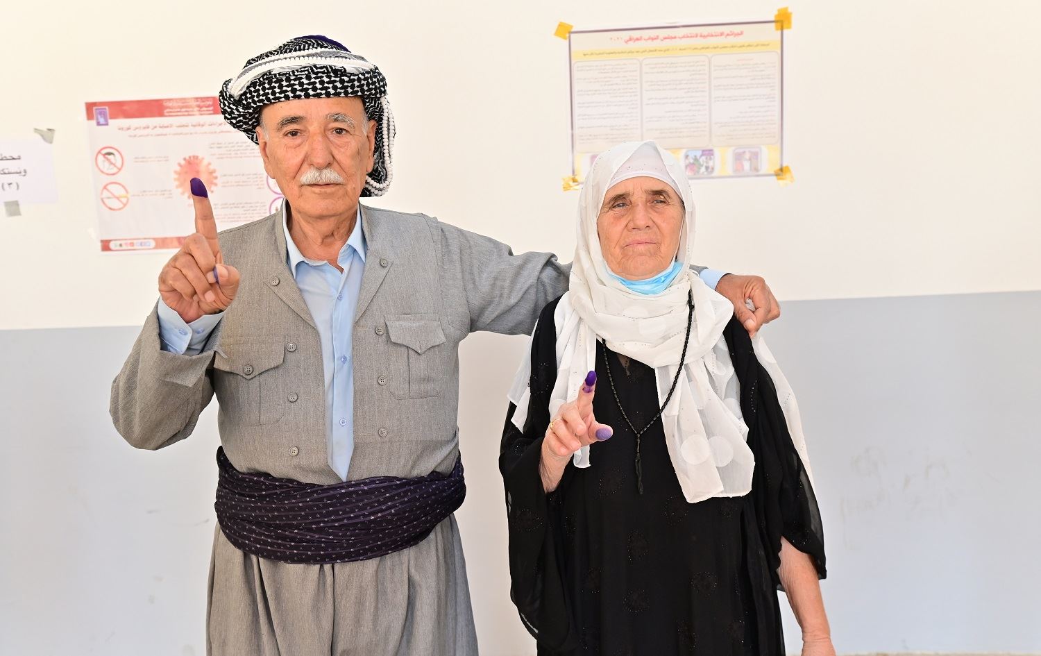A couple show their inked fingers after voting in Iraq's parliamentary election in Erbil on October 10, 2021. Photo: Bilind T. Abdullah/Rudaw