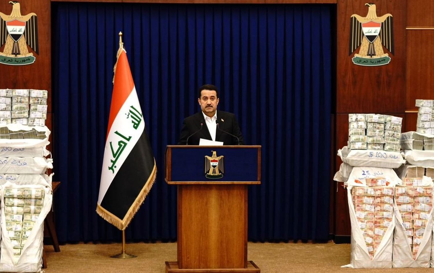Iraqi Prime Minister Mohammed Shia' al-Sudani standing in front of the recovered cash. Photo: Iraqi state media