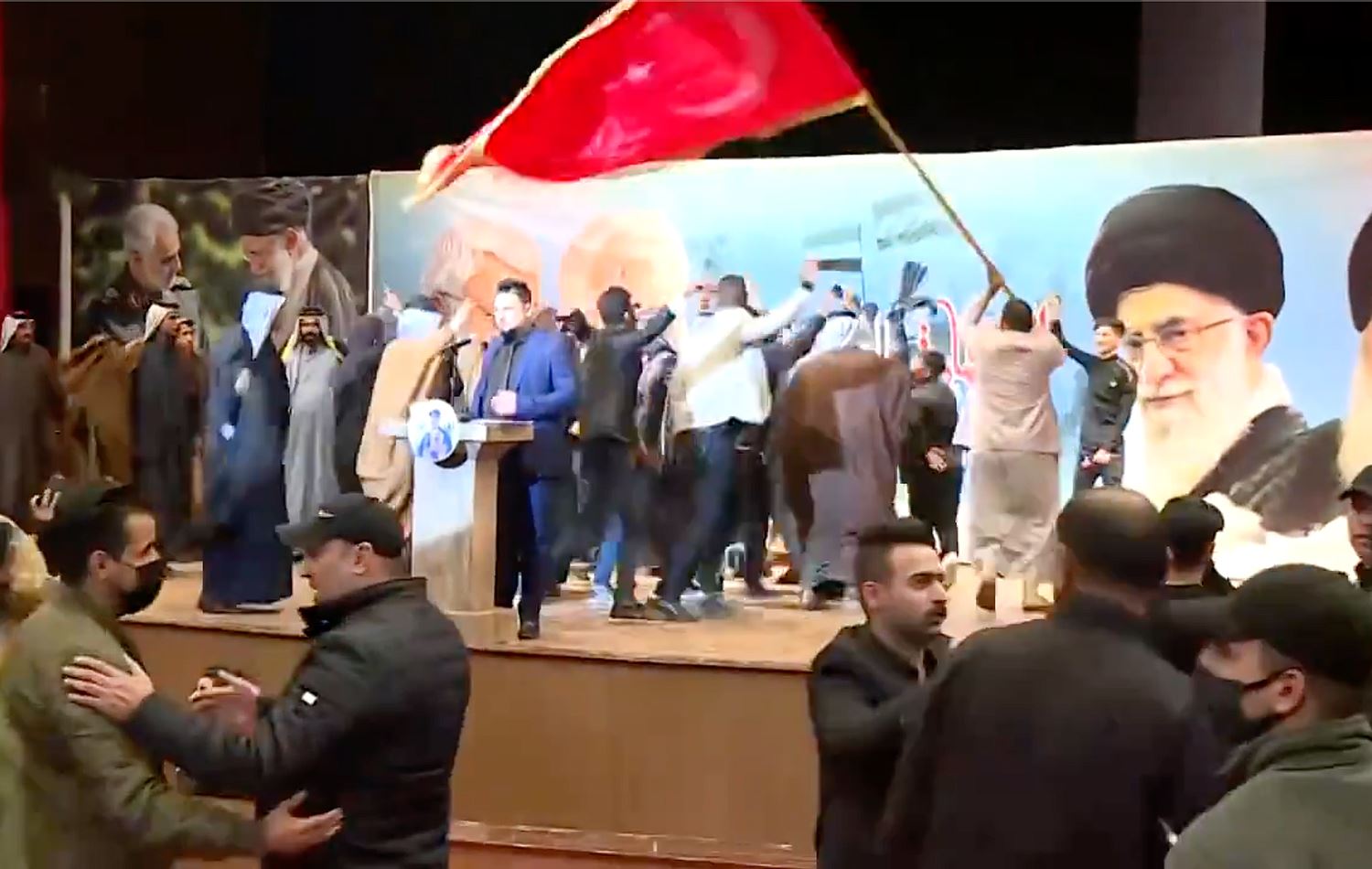 The ceremony, during which American and Israeli flags were placed at the entrance of the hall for attendants to walk over, drew the presence of Popular Mobilization Forces (PMF) leader Falih al-Fayyadh.