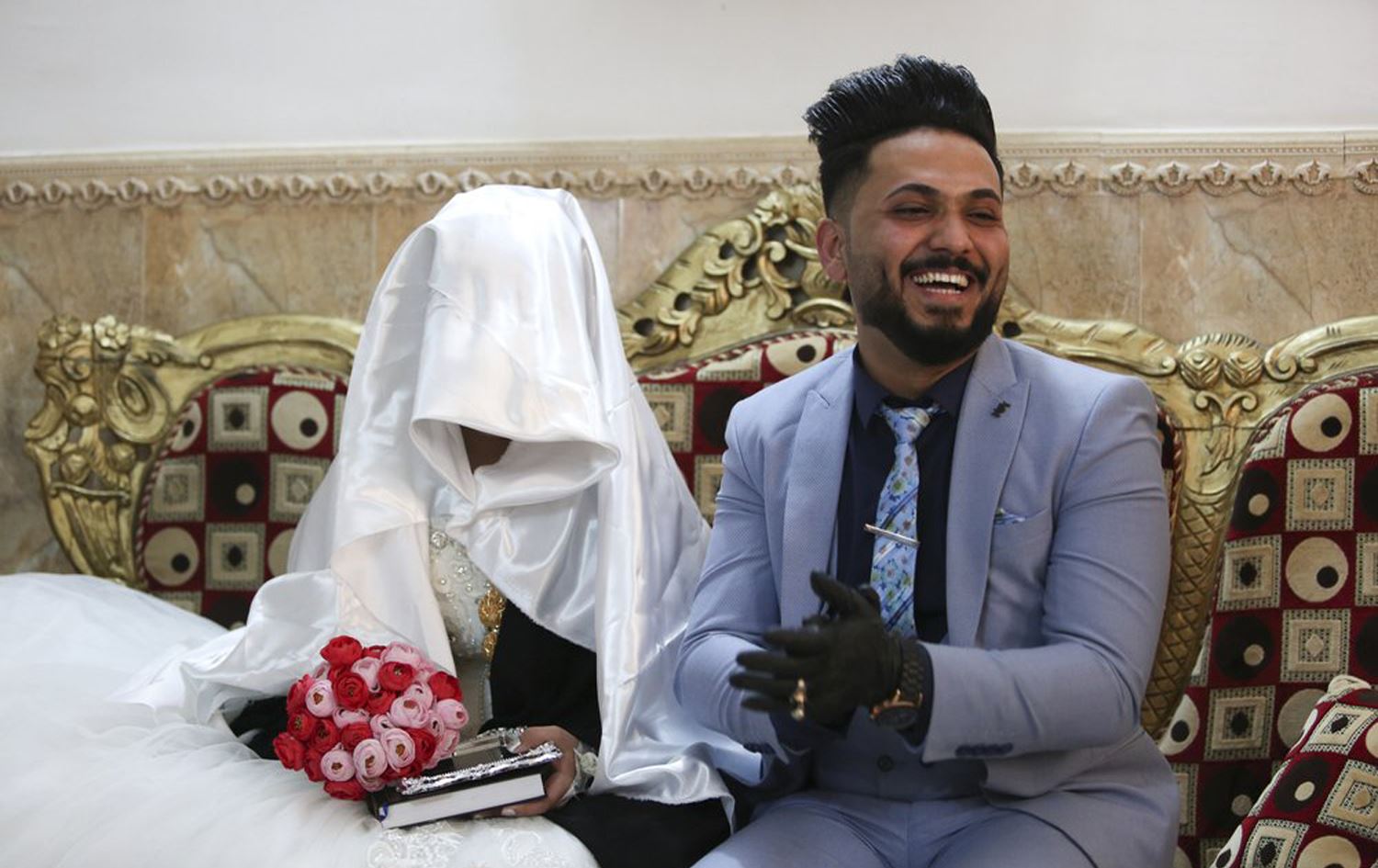 Ahmed Khaled al-Kaabi and his bride Ruqaya Rahim sit during their wedding in Najaf, Iraq, April 9, 2020. Photo: Anmar Khalil / AP
