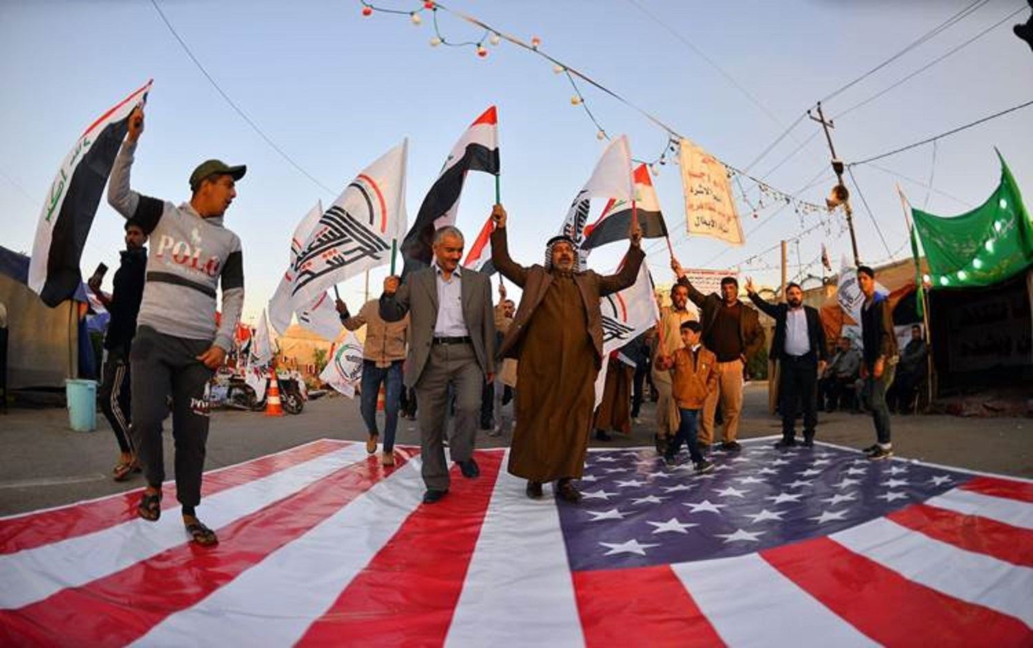 Iraqis in Najaf walk on a US flag on December 30, 2019, during a demonstration to denounce the previous night's attacks by US forces in Al-Qaim. Photo: Haidar Hamdani / AFP