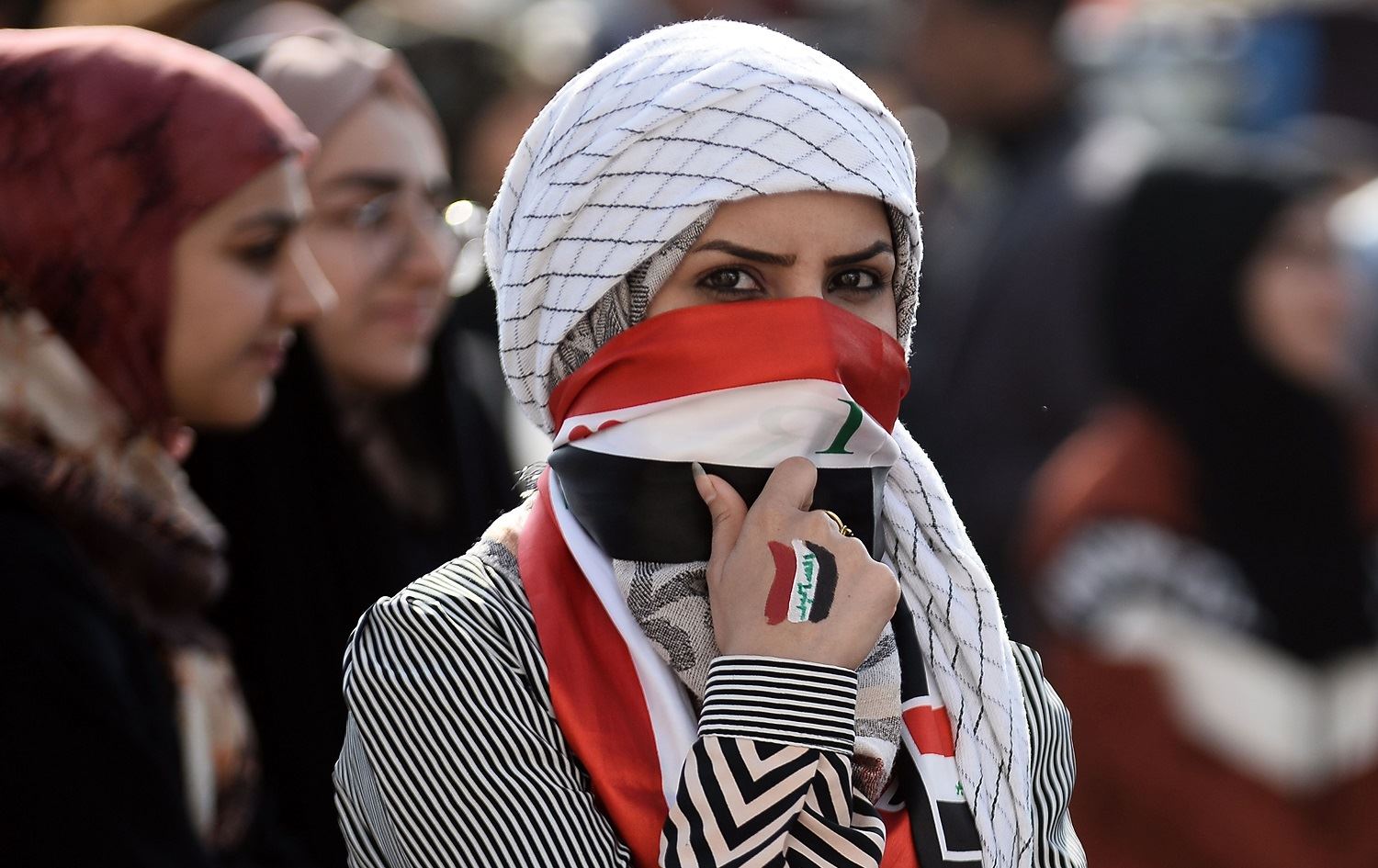 An Iraqi student covers her face with a national flag as she takes part in an anti-government demonstration in Najaf on December 11, 2019. Photo: Haidar Hamdani/AFP