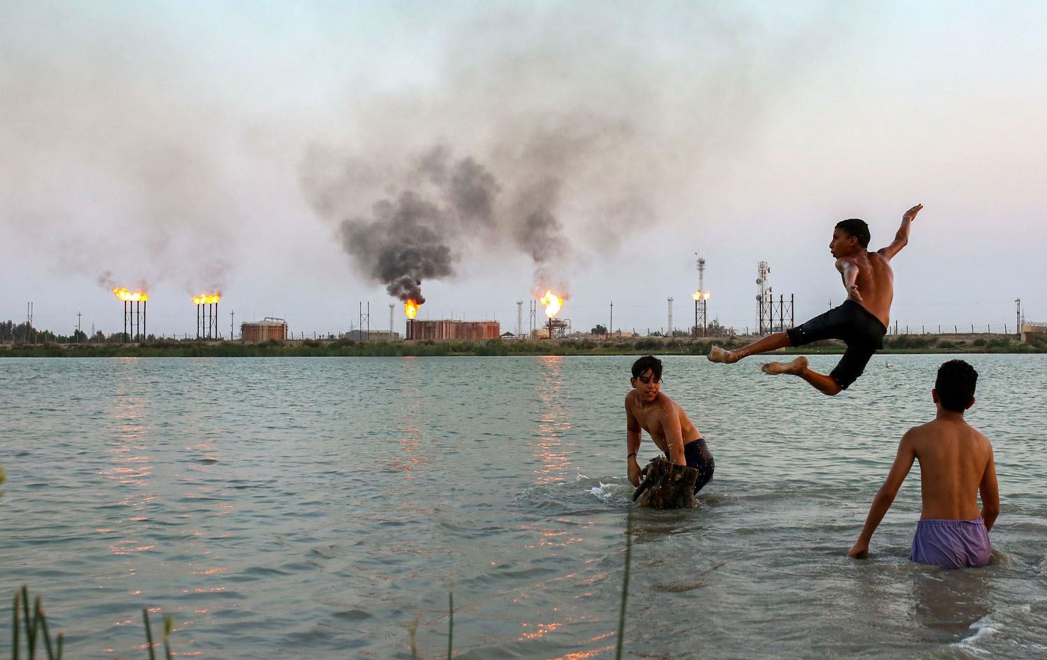 Iraqi youths swim in the Shatt al-Arab waterway at the end of a hot summer day in the southern Iraqi city of Basra on August 11, 2023. Photo: Hussein Faleh/AFP