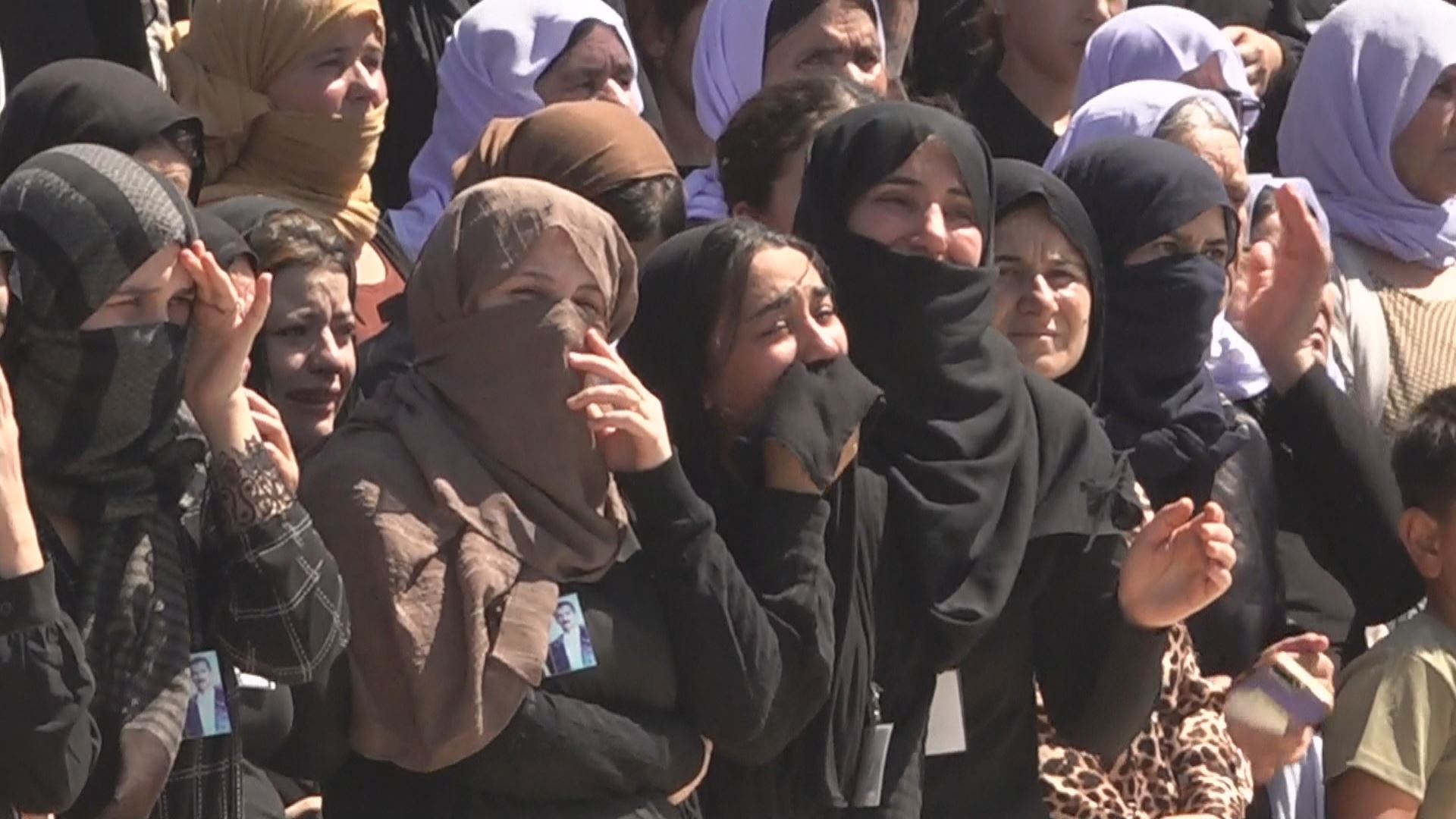 Families of Yazidi victims mourn their loved ones during a burial ceremony for the remains in Shingal on August 13, 2025. Photo: Screengrab/Rudaw