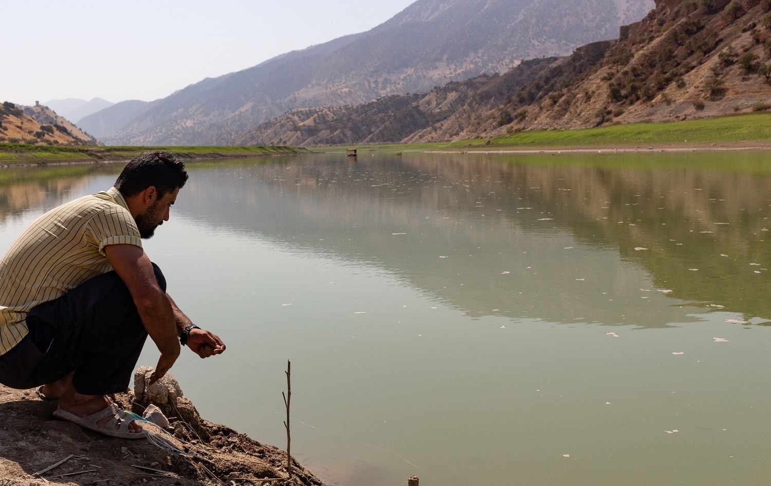 Fisherman Hunar Mohammed Abdullah checks his lines in the Sirwan River on September 20, 2020. Photo: Hannah Lynch/Rudaw