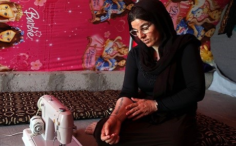 KHANKE DISPLACEMENT CAMP, Iraq – On the floor of her stuffy, dimly-lit tent in Iraq, Yezidi survivor Layleh Shemmo nimbly tugs floral pink fabric through her sewing machine, stitching together a living for her broken family.