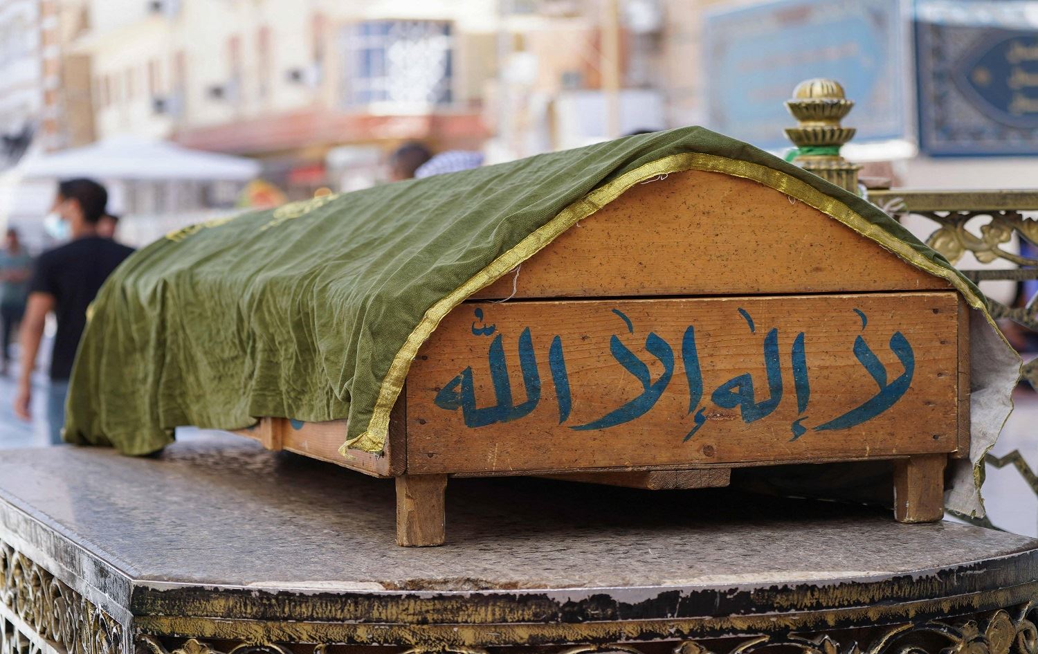 The casket of a victim of the fire at Nasiriyah's al-Hussein hospital is pictured in Najaf on July 13, 2021. Photo: Ali Najafi/AFP