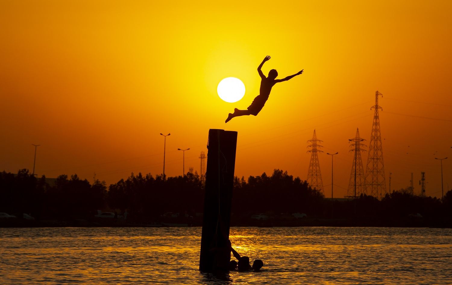 An Iraqi youth dives into the river in the Shatt Al-Arab river in the southern port city of Basra on August 6, 2020. Photo: Hussein Faleh / AFP