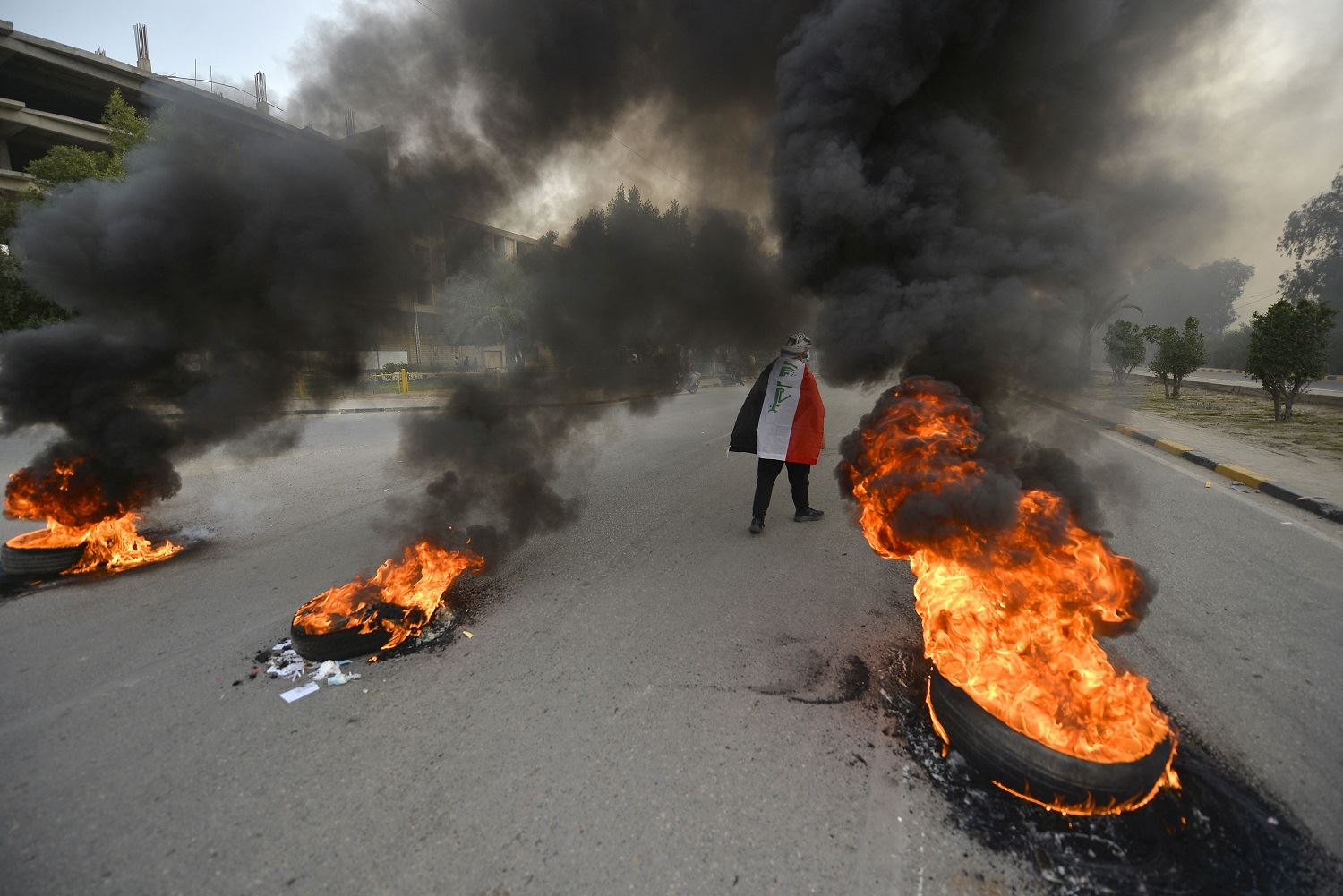 A demonstrator draped in the Iraqi national flag walks past flaming tires during clashes between anti-government protesters in Iraq's central holy shrine city of Najaf on March 15, 2021. Photo: Ali Najafi / AFP