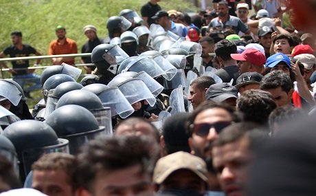 Protesters are held back by police barricades in Basra. Photo: Haidar Mohammed Ali / AFP