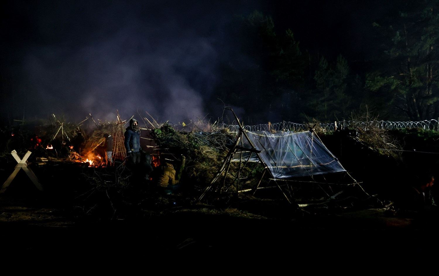 Migrants warm themselves by fires in a camp on the Belarusian-Polish border in the Grodno region on November 14, 2021. Photo: Oksana Manchuk/BELTA/AFP