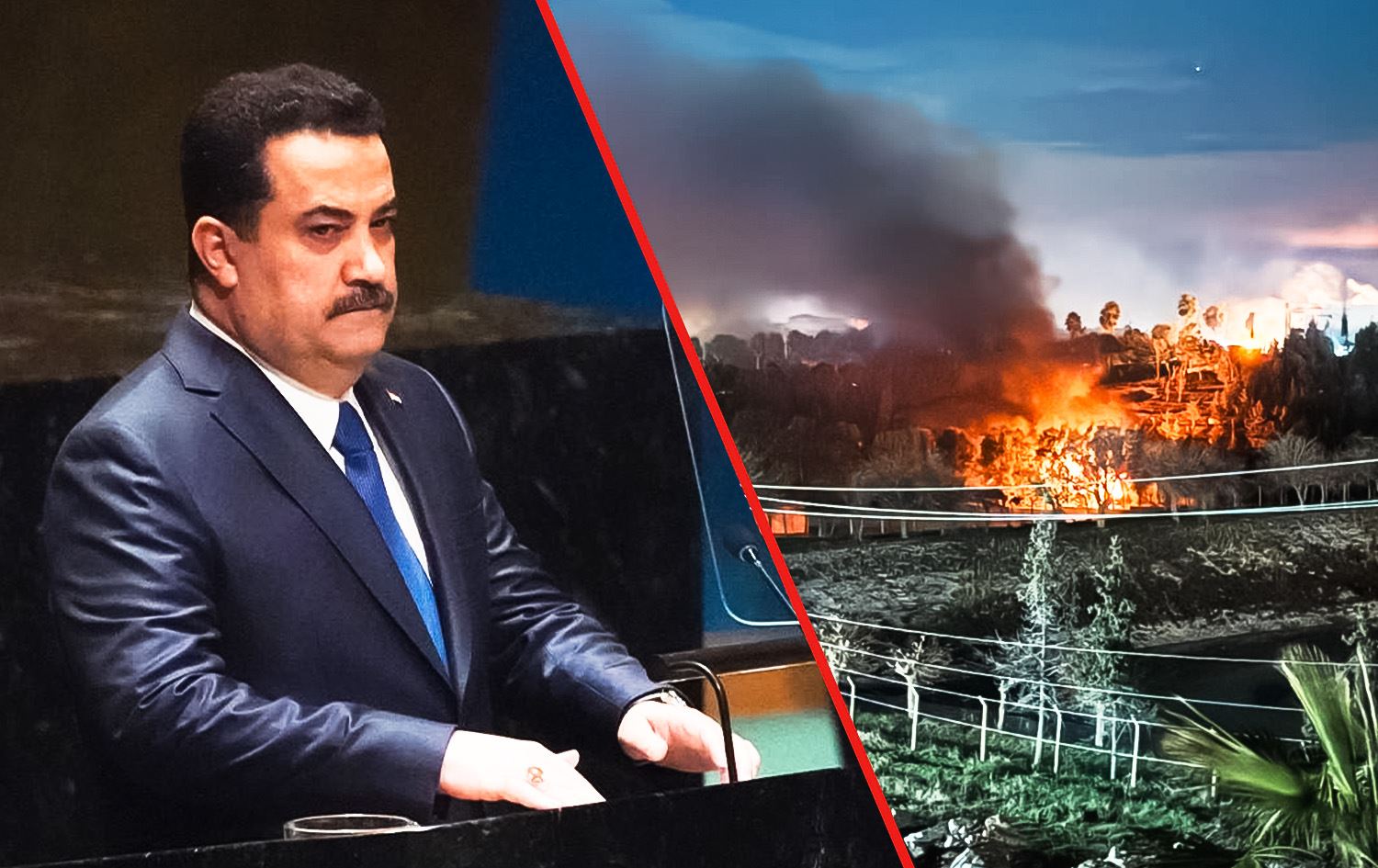 Iraqi Prime Minister Mohammed Shia' al-Sudani addresses the 78th UNGA in New York City on September 22, 2023. Photo: Bryan R. Smith/AFP; Residence of Peshraw Dizayee in Erbil targeted by IRGC ballistic missiles on January 16, 2023. Photo: Rudaw; Graphic: Rudaw