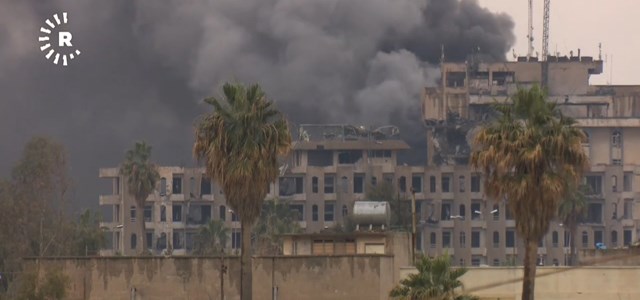 MOSUL, Iraq — Huge plooms of smoke were shown rising from near the Ashur Hotel in the Bab at Tawb neighborhood of western Mosul midday on Thursday by Rudaw cameras.